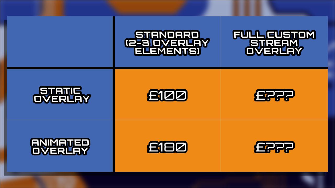 Due to the complexity of a ‘Full Custom Stream Overlay’, an accurate price cannot be given. This will vary depending on whether you require 2D/3D elements in your scene.